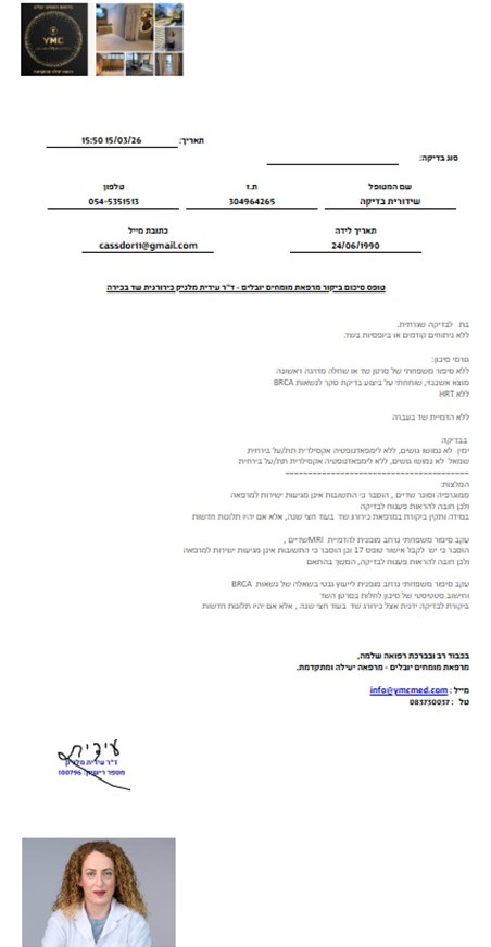 • סיכום ביקור ברור ומסודר- לאחר הביקור המטופל מקבל סיכום מקצועי ומובנה של הייעוץ, עם חתימה דיגיטלית ולוגו המרפאה.